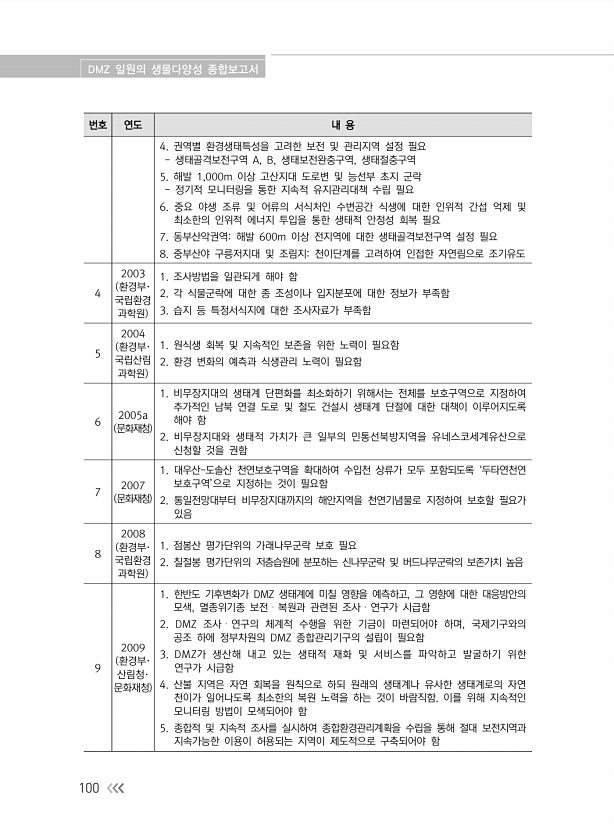 DMZ 일원의 생물다양성 종합보고서 100 번호 연도 내 용 4. 권역별 환경생태특성을 고려한 보전 및 관리지역 설정 필요 생태골격보전구역 A, B, 생태보전완충구역, 생태절충구역 5. 해발 1,000m 이상 고산지대 도로변 및 능선부 초지 군락 정기적 모니터링을 통한 지속적 유지관리대책 수립 필요 6. 중요 야생 조류 및 어류의 서식처인 수변공간 식생에 대한 인위적 간섭 억제 및 최소한의 인위적 에너지 투입을 통한 생태적 안정성 회복 필요 7. 동부산악권역해발 600m 이상 전지역에 대한 생태골격보전구역 설정 필요 8. 중부산야 구릉저지대 및 조림지천이단계를 고려하여 인접한 자연림으로 조기유도 4 2003 환경부· 국립환경 과학원 1. 조사방법을 일관되게 해야 함 2. 각 식물군락에 대한 종 조성이나 입지...
