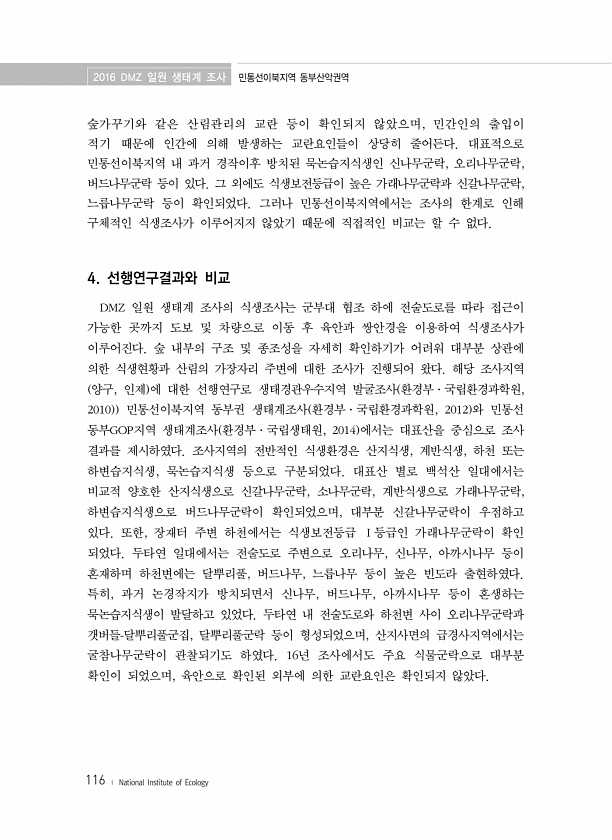 2016 DMZ 일원 생태계 조사 민통선이북지역 동부산악권역 116 ? National Institute of Ecology 숲가꾸기와 같은 산림관리의 교란 등이 확인되지 않았으며, 민간인의 출입이 적기 때문에 인간에 의해 발생하는 교란요인들이 상당히 줄어든다. 대표적으로 민통선이북지역 내 과거 경작이후 방치된 묵논습지식생인 신나무군락, 오리나무군락, 버드나무군락 등이 있다. 그 외에도 식생보전등급이 높은 가래나무군락과 신갈나무군락, 느릅나무군락 등이 확인되었다. 그러나 민통선이북지역에서는 조사의 한계로 인해 구체적인 식생조사가 이루어지지 않았기 때문에 직접적인 비교는 할 수 없다. 4. 선행연구결과와 비교 DMZ 일원 생태계 조사의 식생조사는 군부대 협조 하에 전술도로를 따라 접근이 가능한 곳까지 도보 및...
