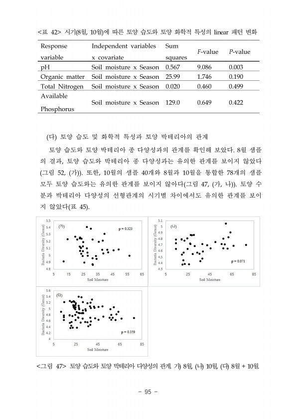 Response variable Independent variables x covariate Sum squares F-value P-value pH Soil moisture x Season 0.567 9.086 0.003 Organic matter Soil moisture x Season 25.99 1.746 0.190 Total Nitrogen Soil moisture x Season 0.020 0.460 0.499 Available Phosphorus Soil moisture x Season 129.0 0.649 0.422 42 ?8 , 10 linear 8 , ? 52, , 10 40 8 10 78 ? 47, , ? ? 45 ? 47 8 , ?10 , 8 + 10