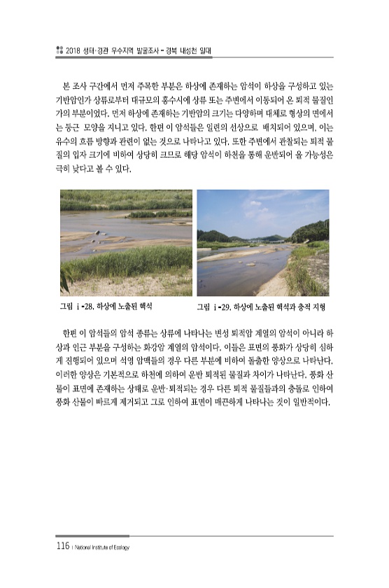 2018 생태·경관 우수지역 발굴조사 경북 내성천 일대 116 ? National Institute of Ecology 본 조사 구간에서 먼저 주목한 부분은 하상에 존재하는 암석이 하상을 구성하고 있는 기반암인가 상류로부터 대규모의 홍수시에 상류 또는 주변에서 이동되어 온 퇴적 물질인 가의 부분이었다. 먼저 하상에 존재하는 기반암의 크기는 다양하며 대체로 형상의 면에서 는 둥근 모양을 지니고 있다. 한편 이 암석들은 일련의 선상으로 배치되어 있으며, 이는 유수의 흐름 방향과 관련이 없는 것으로 나타나고 있다. 또한 주변에서 관찰되는 퇴적 물 질의 입자 크기에 비하여 상당히 크므로 해당 암석이 하천을 통해 운반되어 올 가능성은 극히 낮다고 볼 수 있다. 그림 ⅰ-28. 하상에 노출된 핵석 그림 ⅰ-29. 하상...