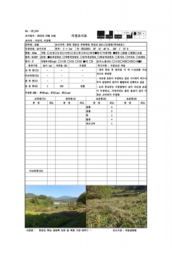 112 No CP_D15 조사일자 2015년 10월 14일 조사자 이선미, 서상령 식생조사표 군락명갈풀 조사지역충북 영동군 추풍령면 죽전리 933-1 도엽명 격자번호 식생상관습지식생 면적5 × 5㎡ 위·경도 GPS 36° 12′ 48″N , 128° 1′ 15″E 해발260m 지형□산정□능선□사면 □상□중□하 □계곡■평지 미세지형■평면 □돌출 □함몰□요철 방위N 330° 토양■갈색삼림토 □적황색삼림토 □암적색삼림토 □회갈색삼림토 □침식토 □미숙토 □암쇄토 경사0° 낙엽부식층 cm □≥20 □ 15 □ 10 ■ 5 □0 암석노 출 % □≥51□ 50□ 25□ 5■0 층위구분 높이 m 식피율 % 우점종 특기사항 수분조건 약습 교 목 층 T1 ·경작 중단 후 방치된 지 약 710년쯤 지난 것으로 판단됨 ·다년생 ...