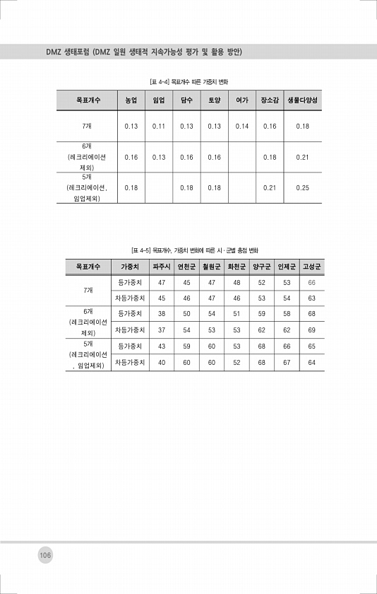 106 DMZ 생태포럼 DMZ 일원 생태적 지속가능성 평가 및 활용 방안 목표개수 농업 임업 담수 토양 여가 장소감 생물다양성 7개 0.13 0.11 0.13 0.13 0.14 0.16 0.18 6개 레크리에이션 제외 0.16 0.13 0.16 0.16 0.18 0.21 5개 레크리에이션, 임업제외 0.18 0.18 0.18 0.21 0.25 [표 4-4] 목표개수 따른 가중치 변화 목표개수 가중치 파주시 연천군 철원군 화천군 양구군 인제군 고성군 7개 등가중치 47 45 47 48 52 53 66 차등가중치 45 46 47 46 53 54 63 6개 레크리에이션 제외 등가중치 38 50 54 51 59 58 68 차등가중치 37 54 53 53 62 62 69 5개 레크리에이션 , 임업제외 등가중치 43 ...