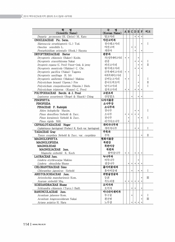 2016 백두대간보호지역 생태계 조사 밀재묘적재 114Ⅰwww.nie.re.kr 학 명 Scientific Name 국 명 Korean Name A B C D E F 비고 Deparia pycnosora H. Christ M. Kato 털고사리 * * * ONOCLEACEAE Pic. Serm. 야산고비과 Matteuccia struthiopteris L. Tod. 청나래고사리 * Ⅰ Onoclea sensibilis L. 야산고비 * * Pentarhizidium orientalis Hook. Hayata 개면마 * * DRYOPTERIDACEAE Herter 관중과 Dryopteris chinensis Baker Koidz. 가는잎족제비고사리 * * * Dryopteris crassirhizoma Nak...