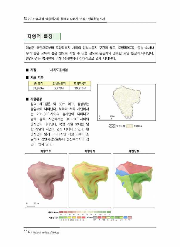 2017 국제적 멸종위기종 뿔제비갈매기 번식·생태환경조사 114 ? National Institute of Ecology 지형적 특징 매섬은 해안으로부터 토양피복지 사이의 암석노출지 구간이 짧고, 토양피복지는 곰솔-소사나 무와 같은 교목이 높은 밀도로 자랄 수 있을 정도로 완경사와 양호한 토양 환경이 나타난다. 완경사면은 북사면에 비해 남사면에서 상대적으로 넓게 나타난다. ■ 지질 사옥도응회암 ■ 지표 피복 총 면적 암반노출지 토양피복지 34,989㎡ 5,779㎡ 29,210㎡ ■ 지형환경 섬의 최고점은 약 30m 이고, 정상부는 중앙부에 나타난다. 북쪽과 서쪽 사면에서 는 20∼30°사이의 경사면이 나타나고 남쪽 동쪽 사면에서는 10∼20°사이의 경사면이 나타난다. 북향 계열 보다는 남 향 계열의 사면이 ...