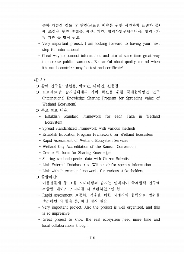116 준화 가능성 검토 및 발전 글로벌 이슈를 위한 시민과학 표준화 등 에 초점을 두면 좋겠음. 예산, 기간, 협력사업구체적내용, 협력국가 및 기관 등 명시 필요 Very important project. I am looking forward to having your next step for international. Great way to connect informations and also at same time great way to increase public awareness. Be careful about quality control when its multi-countriesmay be test and certificate? 다 3조 ? 참여 연구원성선용, 박보란, 나미연, 신현철 ? 프로젝...