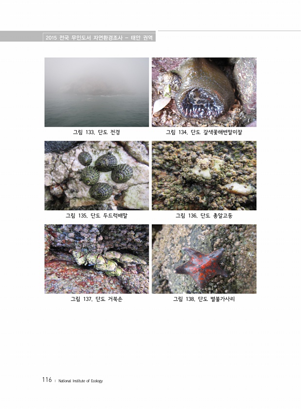 2015 전국 무인도서 자연환경조사 태안 권역 116 ? National Institute of Ecology 그림 133. 단도 전경 그림 134. 단도 갈색꽃해변말미잘 그림 135. 단도 두드럭배말 그림 136. 단도 총알고둥 그림 137. 단도 거북손 그림 138. 단도별불가사리