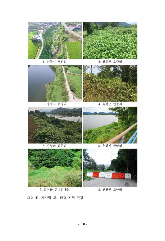 100 1. 안동시 저전리 2. 영동군 호탄리 3. 충주시 중청리 4. 옥천군 원동리 5. 양평군 회현리 6. 춘천시 현암리 7. 화천군 신대리 524 8. 연천군 고능리 그림 41. 가시박 모니터링 지역전경