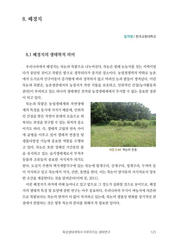 육상생태계에서 이루어지는 생태연구 125 8. 폐경지 김기대 한국교원대학교 8.1 폐경지의 생태학적 의미 우리나라에서 폐경지는 묵논과 묵밭으로 나누어진다. 묵논은 원래 논농사를 짓는 지역이었 다가 중단된 것이고 묵밭은 밭으로 경작되다가 중지된 장소이다. 농업경쟁력의 약화로 농촌 에서 도시로의 인구이동이 증가함에 따라 경작하지 않고 버려진 논과 밭들이 생겨났다. 이런 묵논과 묵밭은, 농촌경관에서의 농경지가 자연 식물을 보호하고, 인위적인 간섭 농사활동과 관리 이 투여되고 있는 하나의 생태계인 것처럼 농경생태계에서 무시할 수 없는 중요한 경관 이 되고 있다. 묵논과 묵밭은 농업생태계와 자연생태 계의 특성을 동시에 가지기 때문에, 인위적 인 간섭을 받은 자연이 본래의 모습으로 회 복되는 과정을 연구할 수 있는 최...