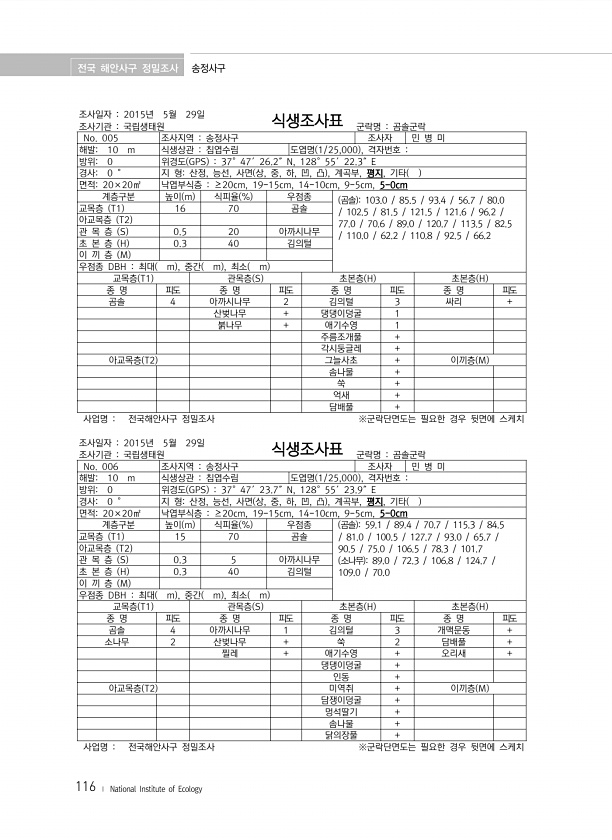 전국 해안사구 정밀조사 송정사구 116 ? National Institute of Ecology 조사일자 2015년 5월 29일 조사기관 국립생태원 식생조사표 군락명 곰솔군락 No. 005 조사지역 송정사구 조사자 민 병 미 해발10 m 식생상관 침엽수림 도엽명 1/25,000 , 격자번호 방위0 위경도 GPS 37°47′26.2″N, 128°55′22.3″E 경사0 ° 지 형산정, 능선, 사면 상, 중, 하, 凹, 凸 , 계곡부, 평지, 기타 면적20×20㎡ 낙엽부식층 ≥20cm, 19-15cm, 14-10cm, 9-5cm, 5-0cm 계층구분 높이 m 식피율 % 우점종 곰솔 103.0 85.5 93.4 56.7 80.0 102.5 81.5 121.5 121.6 96.2 77.0 70.6 89.0 120....