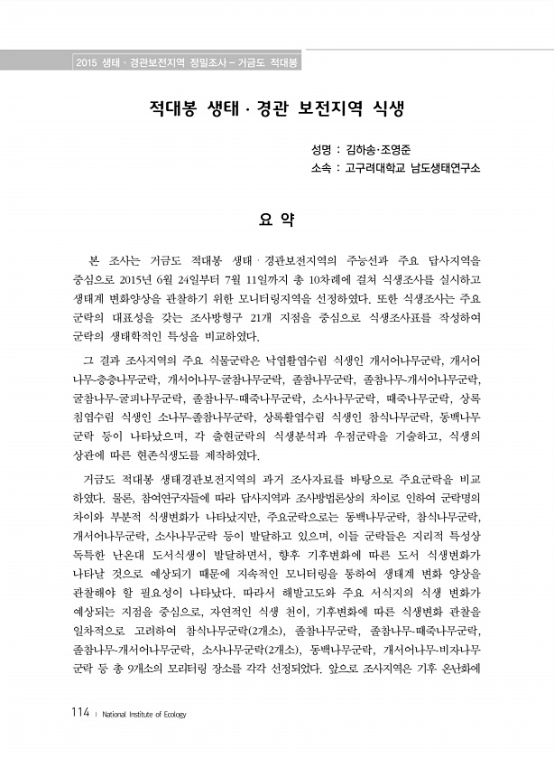 2015 생태·경관보전지역 정밀조사 거금도 적대봉 114 ? National Institute of Ecology 적대봉 생태·경관 보전지역 식생 성명 김하송·조영준 소속 고구려대학교 남도생태연구소 요 약 본 조사는 거금도 적대봉 생태?경관보전지역의 주능선과 주요 답사지역을 중심으로 2015년 6월 24일부터 7월 11일까지 총 10차례에 걸쳐 식생조사를 실시하고 생태계 변화양상을 관찰하기 위한 모니터링지역을 선정하였다. 또한 식생조사는 주요 군락의 대표성을 갖는 조사방형구 21개 지점을 중심으로 식생조사표를 작성하여 군락의 생태학적인 특성을 비교하였다. 그 결과 조사지역의 주요 식물군락은 낙엽활엽수림 식생인 개서어나무군락, 개서어 나무-층층나무군락, 개서어나무-굴참나무군락, 졸참나무군락, 졸참나무-개서어나...