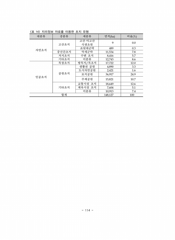 114 대분류 중분류 세분류 면적 비율 자연초지 고산초지 고산 아고산 식생초원 조릿대군락 중산간초지 억새군락 저지초지 수변 초지 기타초지 미분류 인공초지 목장초지 방목지 목초지 공원초지 생활권 공원 도시자연공원 묘지공원 주제공원 기타초지 교통시설 초지 체육시설 초지 미분류 합계 표 14 지리정보 자료를 이용한 초지유형
