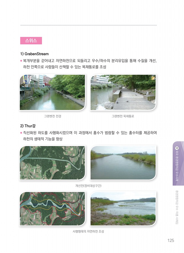 Ⅳ 외국 환경영향저감 우수사례 환경영향저감 우수·미흡 사례집 125 1 GrabenStream ● 복개부분을 걷어내고 자연하천으로 되돌리고 우수/하수의 분리유입을 통해 수질을 개선, 하천 안쪽으로 사람들이 산책할 수 있는 목재통로를 조성 2 Thur강 ● 직선화된 하도를 사행화시켰으며 이 과정에서 홍수가 범람할 수 있는 홍수터를 제공하여 하천의 생태적 기능을 향상 스위스 개선전 정비대상구간 그렌벤천 전경 그렌벤천 목재통로 사행형태의 자연하천조성