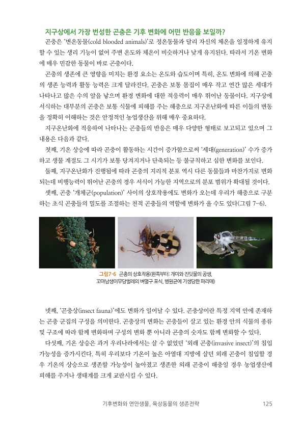 기후변화와 연안생물, 육상동물의 생존전략 125 지구상에서 가장 번성한 곤충은 기후 변화에 어떤 반응을 보일까? 곤충은 ‘변온동물 cold blooded animals ’로 정온동물과 달리 자신의 체온을 일정하게 유지 할 수 있는 생리 기능이 없어 주변 온도와 체온이 비슷하거나 낮게 유지된다. 따라서 기온 변화 에 매우 민감한 동물이 바로 곤충이다. 곤충의 생존에 큰 영향을 미치는 환경 요소는 온도와 습도이며 특히, 온도 변화에 의해 곤충 의 생존 능력과 활동 능력은 크게 달라진다. 곤충은 보통 몸집이 매우 작고 연간 많은 세대가 나타나고 많은 수의 알을 낳으며 환경 변화에 대한 적응력이 매우 뛰어난 동물이다. 지구상에 서식하는 대부분의 곤충은 보통 식물에 피해를 주는 해충으로 지구온난화에 따른 이들의 변동...