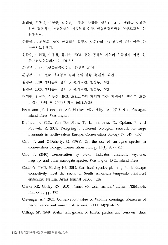 112 최태영 우동걸 이상규 김수연 이종천 양병국 정우진 생태축 보전을 위한 멸종위기 야생동물의 이동특성 연구 국립환경과학원 연구보고서 인 천광역시 한국산지보전협회 산림훼손 복구지 사후관리 모니터링에 관한 연구 한 국산지보전협회 한준수 이혜정 이우철 유기억 춘천 동북부 지역의 식물상과 식생 한 국자연보호학회지 환경부 야생동식물보호법 환경부 과천 환경부 전국 생태통로 설치 운영 현황 환경부 과천 환경부 생태통로 설치 및 관리지침 환경부 과천 환경부 생태통로 설치 및 관리지침 환경부 과천 허위행 임신재 이우신 도로로부터 거리가 다른 지역에서 번식기 조류 군집의 차이 한국생태학회지 112 | 광역생태축의 보전 및 복원을 위한 기반연구