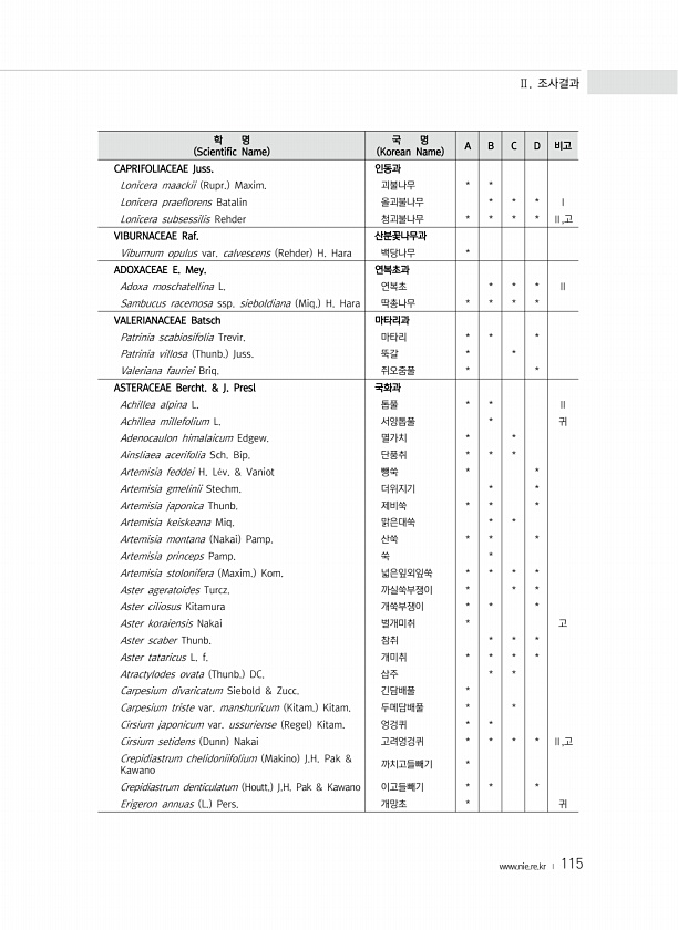 Ⅱ. 조사결과 www.nie.re.kr ? 115 학 명 Scientific Name 국 명 Korean Name A B C D 비고 CAPRIFOLIACEAE Juss. 인동과 Lonicera maackii Rupr. Maxim. 괴불나무 * * Lonicera praeflorens Batalin 올괴불나무 * * * Ⅰ Lonicera subsessilis Rehder 청괴불나무 * * * * Ⅱ,고 VIBURNACEAE Raf. 산분꽃나무과 Viburnum opulus var. calvescens Rehder H. Hara 백당나무 * ADOXACEAE E. Mey. 연복초과 Adoxa moschatellina L. 연복초 * * * Ⅱ Sambucus racemosa ssp. sieboldiana M...
