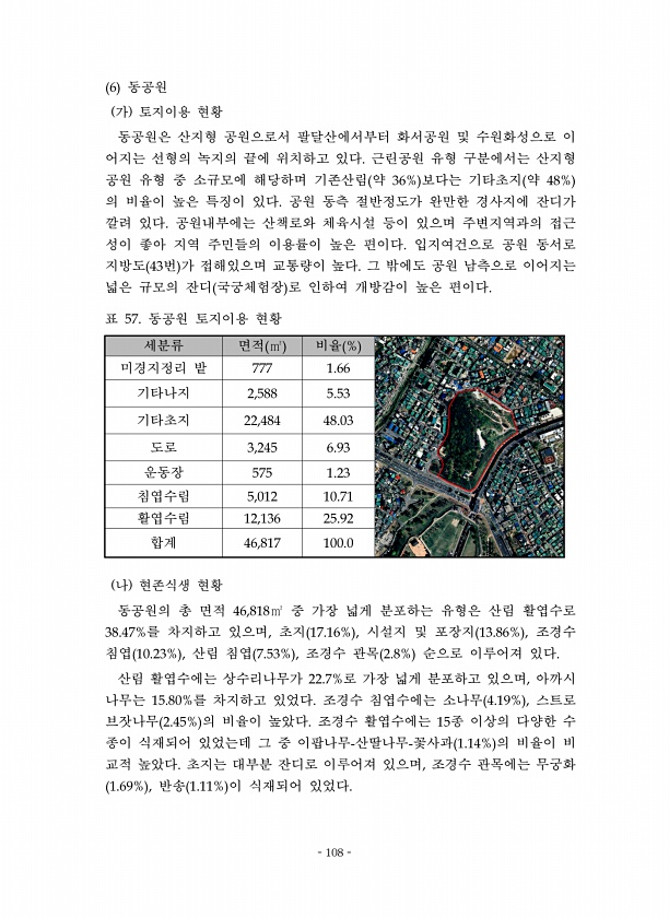 108 동공원 가 토지이용 현황 동공원은 산지형 공원으로서 팔달산에서부터 화서공원 및 수원화성으로 이 어지는 선형의 녹지의 끝에 위치하고 있다 근린공원 유형 구분에서는 산지형 공원 유형 중 소규모에 해당하며 기존산림 약 보다는 기타초지 약 의 비율이 높은 특징이 있다 공원 동측 절반정도가 완만한 경사지에 잔디가 깔려 있다 공원내부에는 산책로와 체육시설 등이 있으며 주변지역과의 접근 성이 좋아 지역 주민들의 이용률이 높은 편이다 입지여건으로 공원 동서로 지방도 번 가 접해있으며 교통량이 높다 그 밖에도 공원 남측으로 이어지는 넓은 규모의 잔디 국궁체험장 로 인하여 개방감이 높은 편이다 세분류 면적 비율 미경지정리 밭 기타나지 기타초지 도로 운동장 침엽수림 활엽수림 합계 표 동공원 토지이용 현황 나 현존식생 현...