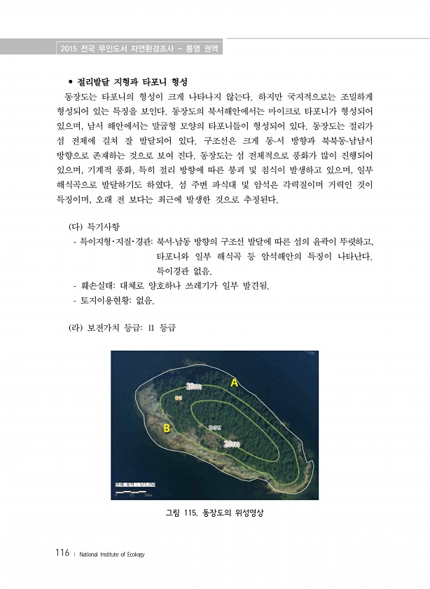 2015 전국 무인도서 자연환경조사 통영 권역 116 ? National Institute of Ecology ? 절리발달 지형과 타포니 형성 동장도는 타포니의 형성이 크게 나타나지 않는다. 하지만 국지적으로는 조밀하게 형성되어 있는 특징을 보인다. 동장도의 북서해안에서는 마이크로 타포니가 형성되어 있으며, 남서 해안에서는 말굽형 모양의 타포니들이 형성되어 있다. 동장도는 절리가 섬 전체에 걸쳐 잘 발달되어 있다. 구조선은 크게 동-서 방향과 북북동-남남서 방향으로 존재하는 것으로 보여 진다. 동장도는 섬 전체적으로 풍화가 많이 진행되어 있으며, 기계적 풍화, 특히 절리 방향에 따른 붕괴 및 침식이 발생하고 있으며, 일부 해식곡으로 발달하기도 하였다. 섬 주변 파식대 및 암석은 각력질이며 거력인 것이 특징이...