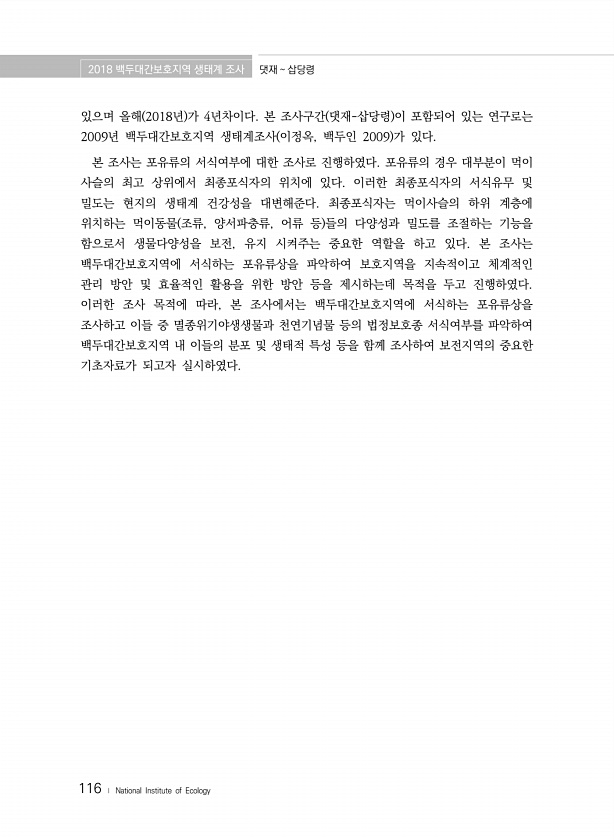 2018 백두대간보호지역 생태계 조사 댓재 삽당령 116 ? National Institute of Ecology 있으며 올해 2018년 가 4년차이다. 본 조사구간 댓재-삽당령 이 포함되어 있는 연구로는 2009년 백두대간보호지역 생태계조사 이정옥, 백두인 2009 가 있다. 본 조사는 포유류의 서식여부에 대한 조사로 진행하였다. 포유류의 경우 대부분이 먹이 사슬의 최고 상위에서 최종포식자의 위치에 있다. 이러한 최종포식자의 서식유무 및 밀도는 현지의 생태계 건강성을 대변해준다. 최종포식자는 먹이사슬의 하위 계층에 위치하는 먹이동물 조류, 양서파충류, 어류 등 들의 다양성과 밀도를 조절하는 기능을 함으로서 생물다양성을 보전, 유지 시켜주는 중요한 역할을 하고 있다. 본 조사는 백두대간보호지역에 서식하는 포...