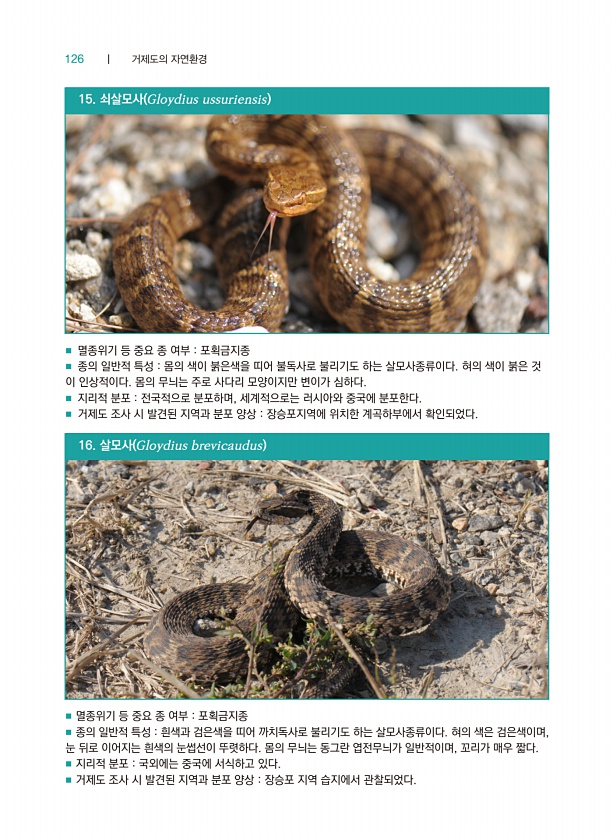 126 ┃ 거제도의 자연환경 15. 쇠살모사 Gloydius ussuriensis 16. 살모사 Gloydius brevicaudus ■ 멸종위기 등 중요 종 여부 포획금지종 ■ 종의 일반적 특성 몸의 색이 붉은색을 띠어 불독사로 불리기도 하는 살모사종류이다. 혀의 색이 붉은 것 이 인상적이다. 몸의 무늬는 주로 사다리 모양이지만 변이가 심하다. ■ 지리적 분포 전국적으로 분포하며, 세계적으로는 러시아와 중국에 분포한다. ■ 거제도 조사 시 발견된 지역과 분포 양상 장승포지역에 위치한 계곡하부에서 확인되었다. ■ 멸종위기 등 중요 종 여부 포획금지종 ■ 종의 일반적 특성 흰색과 검은색을 띠어 까치독사로 불리기도 하는 살모사종류이다. 혀의 색은 검은색이며, 눈 뒤로 이어지는 흰색의 눈썹선이 뚜렷하다. 몸의 무...