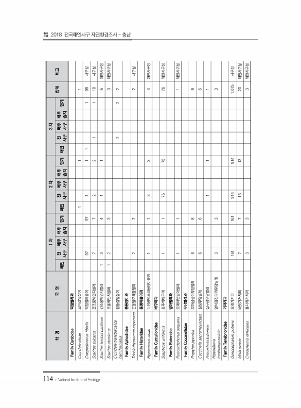 114 학 명 국 명 1 차 2 차 3 차 합계 비고 해빈 전 사구 배후 사구 배후 습지 합계 해빈 사구 전 배후 사구 배후 습지 합계 해빈 사구 전 배후 사구 배후 습지 합계 Family Carabidae 딱정벌레과 Cicindela elisae 꼬마길앞잡이 1 1 1 Craspedonotus tibialis 딱정벌레붙이 97 97 1 1 1 1 99 사구성 Scarites sulcatus 큰조롱박먼지벌레 7 7 2 2 1 1 10 사구성 Scarites terricol pacificus 긴조롱박먼지벌레 1 3 4 1 1 5 해안사구성 Scarites aterrimus 조롱박먼지벌레 1 2 3 3 해안사구성 Cicindela transbaicalica hamifasciatus 참뜰길압잡이 2 2 2 Fam...