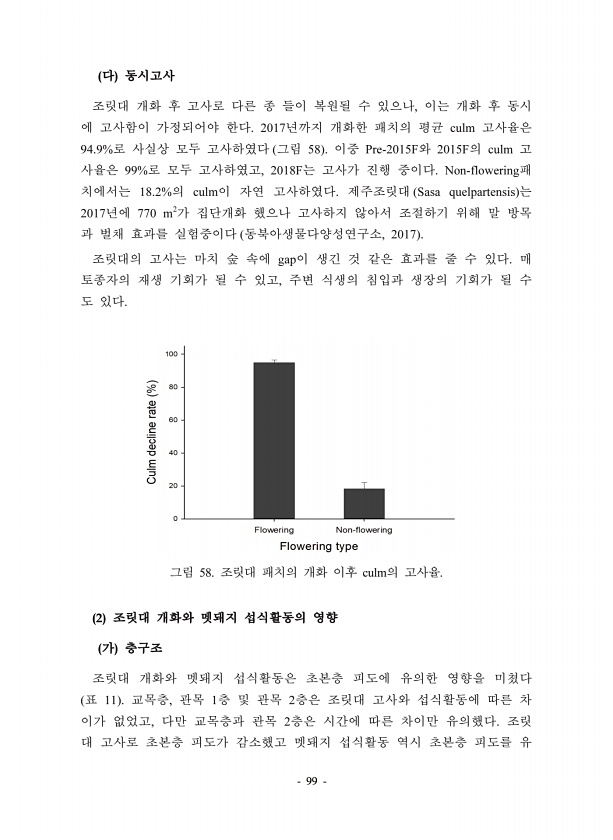 99 , 2017 culm 94.9% 58 Pre-2015F 2015F culm 99% , 2018F Non-flowering 18.2% culm Sasa quelpartensis 2017 770 m2 , 2017 gap , 58. culm 2 11 , 1 2 , 2
