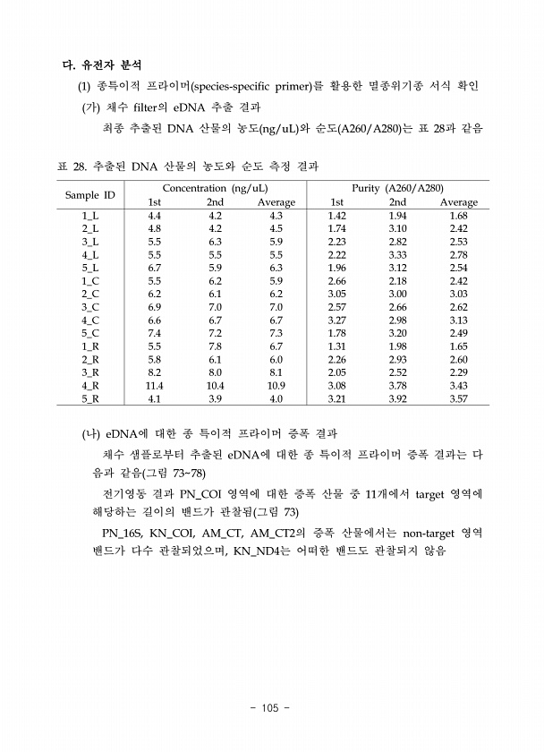 Sample ID Concentration ng/uL Purity A260/A280 1st 2nd Average 1st 2nd Average 1_L 4.4 4.2 4.3 1.42 1.94 1.68 2_L 4.8 4.2 4.5 1.74 3.10 2.42 3_L 5.5 6.3 5.9 2.23 2.82 2.53 4_L 5.5 5.5 5.5 2.22 3.33 2.78 5_L 6.7 5.9 6.3 1.96 3.12 2.54 1_C 5.5 6.2 5.9 2.66 2.18 2.42 2_C 6.2 6.1 6.2 3.05 3.00 3.03 3_C 6.9 7.0 7.0 2.57 2.66 2.62 4_C 6.6 6.7 6.7 3.27 2.98 3.13 5_C 7.4 7.2 7.3 1.78 3.20 2.49 1_R 5.5 7.8...