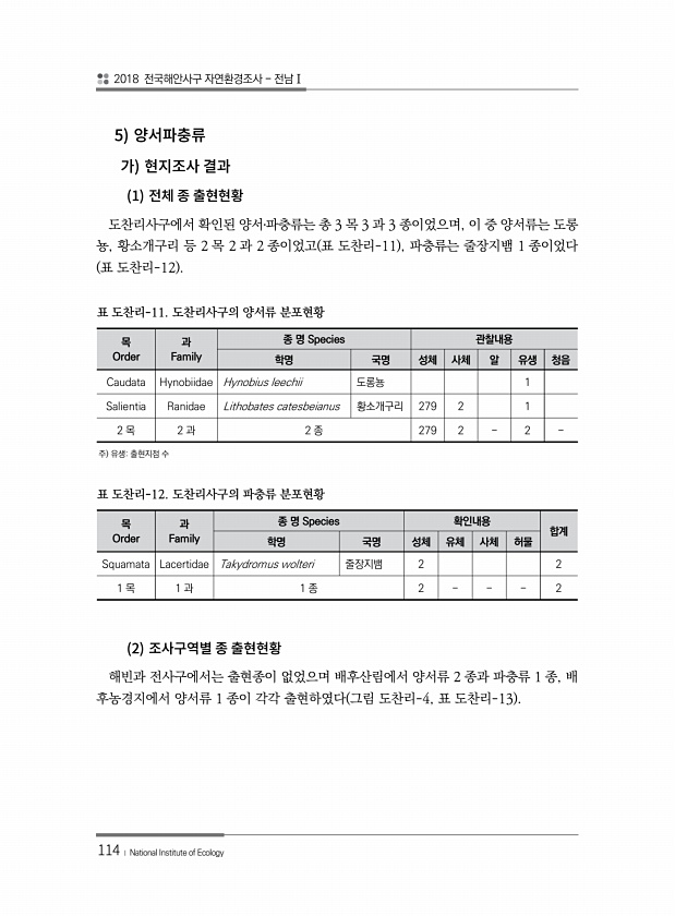 2018 전국해안사구 자연환경조사 전남Ⅰ 114 ? National Institute of Ecology 5 1 도찬리사구에서 확인된 양서?파충류는 총 3 목 3 과 3 종이었으며, 이 중 양서류는 도롱 뇽, 황소개구리 등 2 목 2 과 2 종이었고 표 도찬리-11 , 파충류는 줄장지뱀 1 종이었다 표 도찬리-12 목 Order 과 Family 종 명 Species 관찰내용 학명 국명 성체 사체 알 유생 청음 Caudata Hynobiidae Hynobius leechii 도롱뇽 1 Salientia Ranidae Lithobates catesbeianus 황소개구리 279 2 1 2 목 2 과 2 종 279 2 2 표 도찬리-11. 도찬리사구의 양서류 분포현황 주 유생출현지점 수 목 Order 과 Fami...