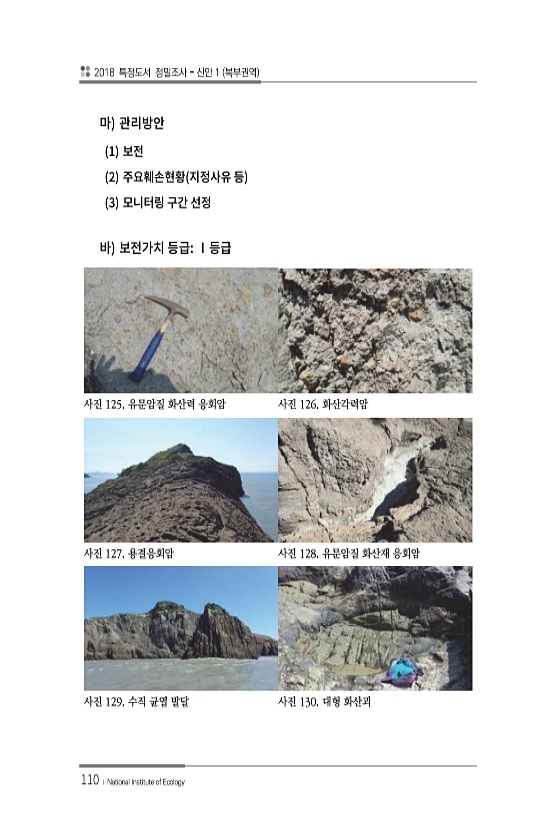 2018 특정도서 정밀조사 신안 1 북부권역 110 ? National Institute of Ecology 1 2 3 사진 125. 유문암질 화산력 응회암 사진 126. 화산각력암 사진 127. 용결응회암 사진 128. 유문암질 화산재 응회암 사진 129. 수직 균열 발달 사진 130. 대형화산괴