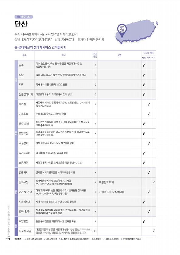 No. 제주- 제주 057 본 생태자산의 생태계서비스 간이평가지 구분 예시 평가 등급 설명 규모별 혜택 지점 지역 국가 공급 담수 식수, 농업용수, 축산 용수 등 물을 저장하여 식수 및 농업용수를 제공 0 √ 식량 곡물, 과실, 물고기 등 인간 및 야생동물에게 먹거리 제공 + √ 자원 목재나 약재 등 상품의 재료로 활용 0 √ 친환경에너지 태양열이나 풍력, 조력을 통해 전기 생산 0 √ 조절 대기질 자동차 배기가스, 산업체 대기오염, 농업발생 먼지, 미세먼지 등 대기오염 감소 + √ 기후조절 온실가스를 줄이고 기후변화 완화 + √ 홍수 재해 홍수로 인한 범람에 대한 조절, 집중강우에 대한 조절 폭우로 인한 홍수피해 저감 + √ 토양유실 토양 소실을 방어하는 밀도 높은 식생의 존재, 비와 바람으로 인한 토양유...
