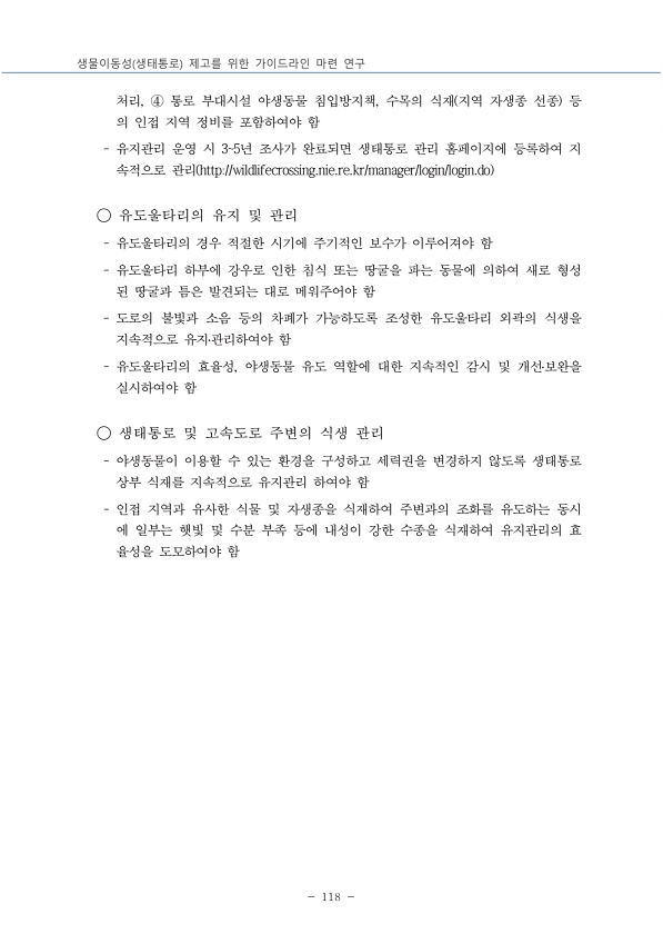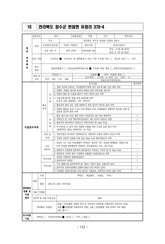 112 16 전라북도 장수군 번암면 유정리 378-4 해 당 생 태 통 로 준공연도 2017 겸용/전용 전용 근거 백두대간 위치 주소 전라북도 장수군 번암면 유정리 378-4 도로명 도로번호 지방도 743호선 관리기관 한국도로공사 도로 차선 수 왕복 3차선 좌표 WGS 84 위도N 35 28 40.70 경도E 127 32 45.27 조성 기법 신규조성 ■, 수로박스 등 생태통로가 아닌 기존 구조물 개선 □, 펜스만 설치 □, 기타설치 배경 환경영향평가 □, 한반도생태축복원사업 ■, 지자체 자체 계획 □, 생태보전반환협력금 □ 유형 및 규격 육교형 □ 터널형 ■, 양서?파충류 통로 □ 길이12m, 너비 60m 입구면적㎡ 너비 m, 높이 m , 길이m 개방도 입구면적/길이 지침준수여부 통로 규격 육 교 형 조사...