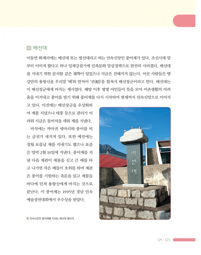 124 125 배선대 이동면 화계리에는 배선대 또는 벌선대라고 하는 민속신앙인 풍어제가 있다. 조선시대 말 부터 이어져 왔다고 하나 일제강점기에 민족문화 말살정책으로 완전히 사라졌다. 배선대 를 지내기 위한 문서함 같은 궤짝이 있었으나 지금은 전해지지 않는다. 이곳 사람들은 앵 강만의 용왕신을 우리말 ‘배’와 한자어 ‘선 船 ’을 합쳐서 배선장군이라고 한다. 배선대는 이 배선장군에게 바치는 제사였다. 해방 이후 몇몇 어민들이 뜻을 모아 어촌생활의 어려 움을 이겨내고 풍어를 빌기 위해 풍어제를 다시 시작하여 현재까지 민속신앙으로 이어지 고 있다. 이전에는 배선장군을 우상화하 여 제를 지냈으나 태풍 등으로 관리가 어 려워 지금은 돌비석을 세워 제를 지낸다. 비석에는 까마귀 세마리와 풍어를 비 는 글귀가 새겨져 ...