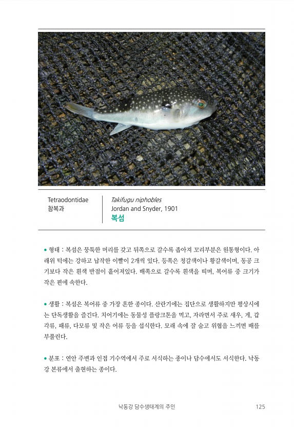 낙동강 담수생태계의 주인 125 ? 형태 복섬은 뭉툭한 머리를 갖고 뒤쪽으로 갈수록 좁아져 꼬리부분은 원통형이다. 아 래위 턱에는 강하고 납작한 이빨이 2개씩 있다. 등쪽은 청갈색이나 황갈색이며, 동공 크 기보다 작은 흰색 반점이 흩어져있다. 배쪽으로 갈수록 흰색을 띠며, 복어류 중 크기가 작은 편에 속한다. ? 생활 복섬은 복어류 중 가장 흔한 종이다. 산란기에는 집단으로 생활하지만 평상시에 는 단독생활을 즐긴다. 치어기에는 동물성 플랑크톤을 먹고, 자라면서 주로 새우, 게, 갑 각류, 패류, 다모류 및 작은 어류 등을 섭식한다. 모래 속에 잘 숨고 위협을 느끼면 배를 부풀린다. ? 분포 연안 주변과 인접 기수역에서 주로 서식하는 종이나 담수에서도 서식한다. 낙동 강 본류에서 출현하는 종이다. Tetrao...