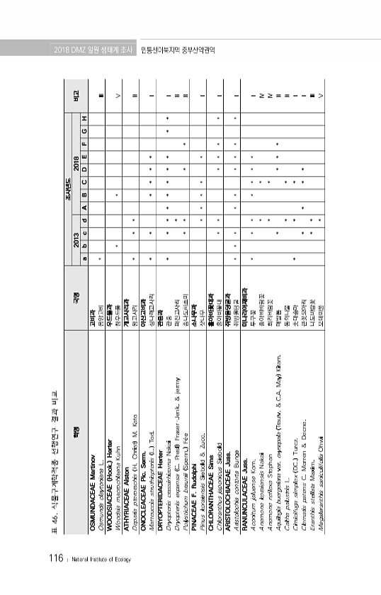 116 ? National Institute of Ecology 학명 국명 조사년도 2013 2018 비고 a b c d A B C D E F G H OSMUNDACEAE Martinov 고비과 Osmunda claytoniana L. 음양고비 * Ⅲ WOODSIACEAE Hook. Herter 우드풀과 Woodsia macrochlaena Kuhn 참우드풀 * * Ⅴ ATHYRIACEAE Alston 개고사리과 Deparia pterorachis H. Christ M. Kato 왕고사리 * * * Ⅱ ONOCLEACEAE Pic. Serm. 야산고비과 Matteuccia struthiopteris L. Tod. 청나래고사리 * * * * * * Ⅰ DRYOPTERIDACEAE Herter 관중과 Dryop...