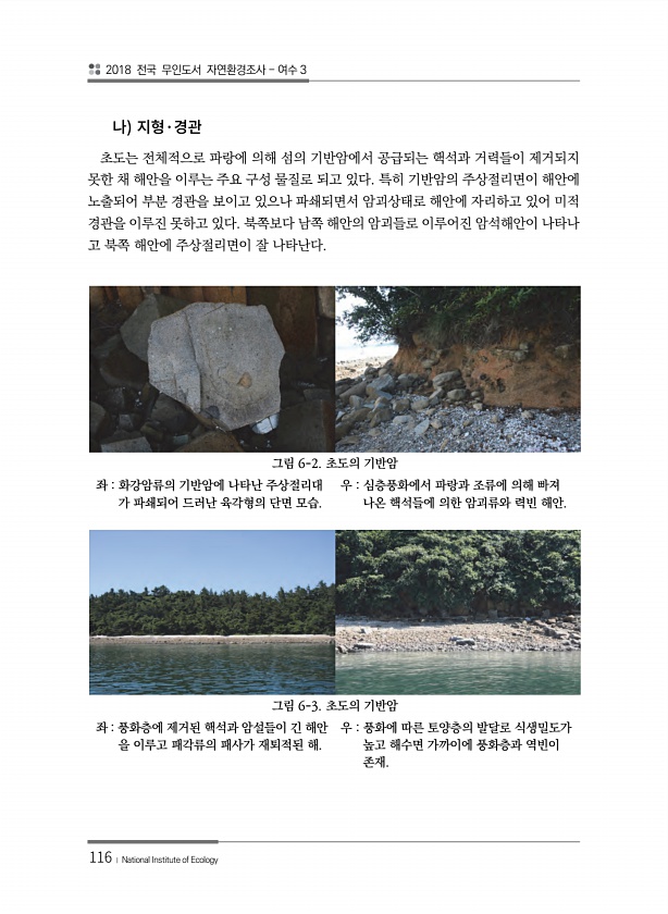 2018 전국 무인도서 자연환경조사 여수 3 116 ? National Institute of Ecology · 초도는 전체적으로 파랑에 의해 섬의 기반암에서 공급되는 핵석과 거력들이 제거되지 못한 채 해안을 이루는 주요 구성 물질로 되고 있다. 특히 기반암의 주상절리면이 해안에 노출되어 부분 경관을 보이고 있으나 파쇄되면서 암괴상태로 해안에 자리하고 있어 미적 경관을 이루진 못하고 있다. 북쪽보다 남쪽 해안의 암괴들로 이루어진 암석해안이 나타나 고 북쪽 해안에 주상절리면이 잘 나타난다. 그림 6-2. 초도의 기반암 좌 화강암류의 기반암에 나타난 주상절리대 가 파쇄되어 드러난 육각형의 단면 모습. 우 심층풍화에서 파랑과 조류에 의해 빠져 나온 핵석들에 의한 암괴류와 력빈 해안. 그림 6-3. 초도의 기반암 ...