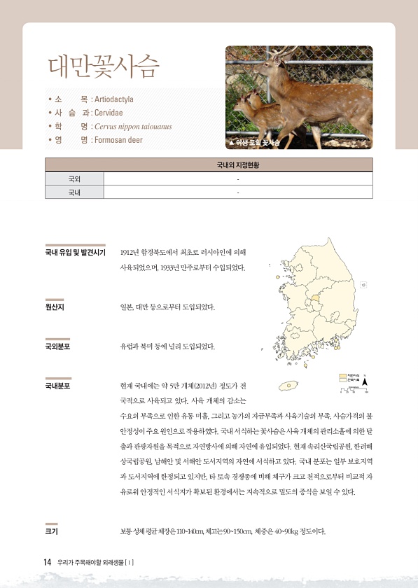 14 우리가 주목해야할 외래생물 [Ⅰ] 국내 유입 및 발견시기 1912년 함경북도에서 최초로 러시아인에 의해 사육되었으며, 1933년만주로부터수입되었다. 원산지 일본, 대만 등으로부터 도입되었다. 국외분포 유럽과 북미 등에 널리 도입되었다. 국내분포 현재 국내에는 약 5만 개체 2012년 정도가 전 국적으로 사육되고 있다. 사육 개체의 감소는 수요의 부족으로 인한 유통 미흡, 그리고 농가의 자금부족과 사육기술의 부족, 사슴가격의 불 안정성이 주요 원인으로 작용하였다. 국내 서식하는 꽃사슴은 사육 개체의 관리소홀에 의한 탈 출과 관광자원을 목적으로 자연방사에 의해 자연에 유입되었다. 현재 속리산국립공원, 한려해 상국립공원, 남해안 및 서해안 도서지역의 자연에 서식하고 있다. 국내 분포는 일부 보호지역 과 도서...