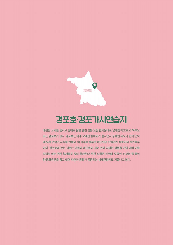 011 강릉 경 경 경 경경 경 경 경 경 경 경 경포호·경포가시연습지 대관령 고개를 등지고 동해로 팔을 벌린 강릉 도심 한가운데로 남대천이 흐르고, 북쪽으 로는 경포호가 있다. 경포호는 아주 오래전 빙하기가 끝나면서 동해안 파도가 만의 언덕 에 모래 언덕인 사주를 만들고, 이 사주로 해수와 차단되어 만들어진 석호이자 자연호수 이다. 경포호와 같은 석호는 민물과 바닷물이 섞여 있어 다양한 생물을 키워 내며 이를 먹이로 삼는 귀한 철새들도 많이 찾아온다. 또한 강릉은 경포대, 오죽헌, 선교장 등 풍성 한 문화유산을 품고 있어 자연과 문화가 공존하는 생태관광지로 거듭나고 있다.강원도