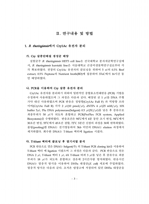 3 Ⅱ. 연구내용 및 방법 1. B. thuringiensis에서 Cry1Ac 유전자 분리 가. Cry 살충단배질 생성균 배양 실험균주 B. thuringiensis HD73 cell line은 건국대학교 분자세균학연구실에 서, B. thuringiensis kurstaki line은 서울대학교 곤충미생물학연구실로부터 각 각 확보하였다. 전장의 Cry1Ac 유전자의 클로닝을 위하여 5 ㎖의 0.3% Beef extract, 0.5% Peptone의 Nutrient broth BD 에 접종하여 37oC에서 16시간 동 안 배양하였다. 나. PCR을 이용하여 Cry 살충 유전자 분리 Cry1Ac 유전자를 분리하기 위하여 일반적인 중합효소연쇄반응 PCR 기법을 수정하여 사용하였으며 그 과정은 다음과 같다. 배양된...