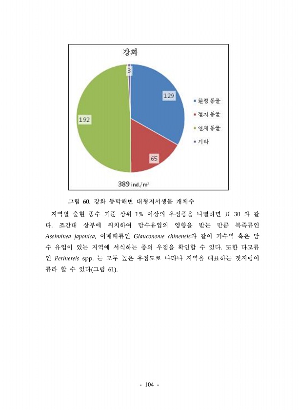 104 그림 60. 강화 동막해변 대형저서생물 개체수 지역별 출현 종수 기준 상위 1% 이상의 우점종을 나열하면 표 30 와 같 다. 조간대 상부에 위치하여 담수유입의 영향을 받는 만큼 복족류인 Assiminea japonica, 이매패류인 Glauconome chinensis와 같이 기수역 혹은 담 수 유입이 있는 지역에 서식하는 종의 우점을 확인할 수 있다. 또한 다모류 인 Perinereis spp. 는 모두 높은 우점도로 나타나 지역을 대표하는 갯지렁이 류라 할 수 있다 그림 61