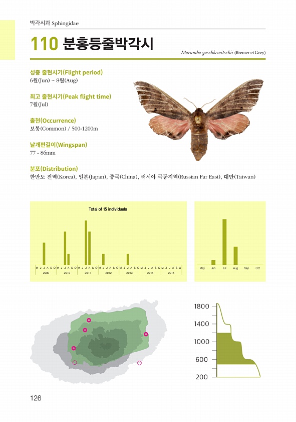 126 박각시과 Sphingidae 성충 출현시기 Flight period 6월 Jun 8월 Aug 최고 출현시기 Peak fight time 7월 Jul 출현 Occurrence 보통 Common 500-1200m 날개편길이 Wingspan 77 86mm 분포 Distribution 한반도 전역 Korea , 일본 Japan , 중국 China , 러시아 극동지역 Russian Far East , 대만 Taiwan Marumba gaschkewitschii Bremer et Grey M J J A S O M J J A S O M J J A S O M J J A S O M J J A S O M J J A S O M J J A S O May Jun Jul Aug Sep Oct 2009 2010 2011 201...