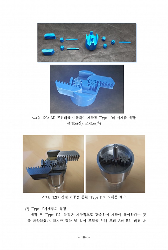 104 그림 120 3D 프린터를 이용하여 제작된 ‘Type 1’의 시제품 제작분해도 상 , 조립도 하 그림 121 정밀 가공을 통한 ‘Type 1’의 시제품 제작 2 ‘Type 1’시제품의 특징 제작 후 ‘Type 1’의 특징은 기구적으로 단순하여 제작이 용이하다는 것 을 파악하였다. 하지만 절삭 날 길이 조절을 위해 모터 A와 B의 회전속