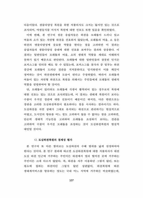 107 다음이었다. 생물다양성 복원을 위한 지불의사도 크지는 않지만 있는 것으로 조사되어, 야생동식물 서식지 복원에 대한 선호도 또한 있음을 확인하였다. 이에 반해, 본 연구의 설문 응답자들은 하천을 모래톱이 드러나 있고 여울과 소가 있는 자연형 하천을 선호하지 않았는데, 모래톱과 여울, 소 등은 하천의 생물다양성에 중요한 역할을 한다는 점을 고려하면 이 결과는 응답자들의 생물다양성 증대에 대한 선호를 보여주는 결과와 상충한다. 이 결과는 일반인들이 모래톱과 여울, 소의 생태적 역할을 제대로 이해하지 못하기 있기 때문으로 판단된다. 모래톱에 대한 일반인들의 잘못된 인식은 포커스그룹 인터뷰 때도 알 수 있었는데, 포커스그룹 참가자 중 일부는 하천 중간에 모래톱이 드러난 경관을 지저분하다고 인식하면서 이를 깨끗...
