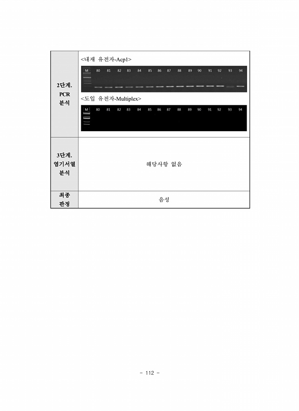 112 2단계. PCR 분석 내재 유전자-Acp1 도입 유전자-Multiplex 3단계. 염기서열 분석 해당사항 없음 최종 판정음성