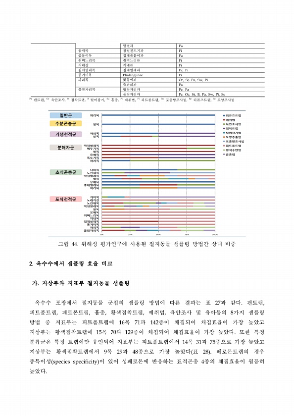 말벌과 Pa 응애목 참털진드기과 Pi 좀붙이목 집게좀붙이과 Pa 쥐며느리목 쥐며느리류 Pi 지네강 지네류 Pi 집게벌레목 집게벌레과 Pc, Pi 통거미목 Phalangiinae Pi 파리목 꽃등에과 Oc, St, Pa, Sw, Pi 춤파리과 Pa 풀잠자리목 뱀잠자리과 Pc, Pa 풀잠자리과 Pc, Oc, St, B, Pa, Sw, Pi, Su Pa 팬트랩, Oc 육안조사, St 점착트랩, B 털어잡기, Su 흡충, Pc 예취법, Pi 피트폴트랩, Sw 포충망조사법, Re 리퓨즈트랩, So 토양조사법 그림 44. 위해성 평가연구에 사용된 절지동물 샘플링 방법간 상대 비중 2. 옥수수에서 샘플링 효율 비교 가. 지상부와 지표부 절지동물 샘플링 옥수수 포장에서 절지동물 군집의 샘플링 방법에 따른 결과는 표 27과...