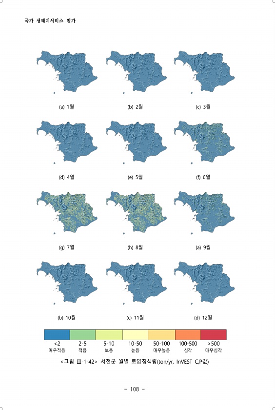 국가 생태계서비스 평가 108 a 1월 b 2월 c 3월 d 4월 e 5월 f 6월 g 7월 h 8월 a 9월 b 10월 c 11월 d 12월 2 2-5 5-10 10-50 50-100 100-500 500 매우적음 적음 보통 높음 매우높음 심각 매우심각 그림 Ⅲ-1-42 서천군 월별 토양침식량 ton/yr, InVEST C,P값
