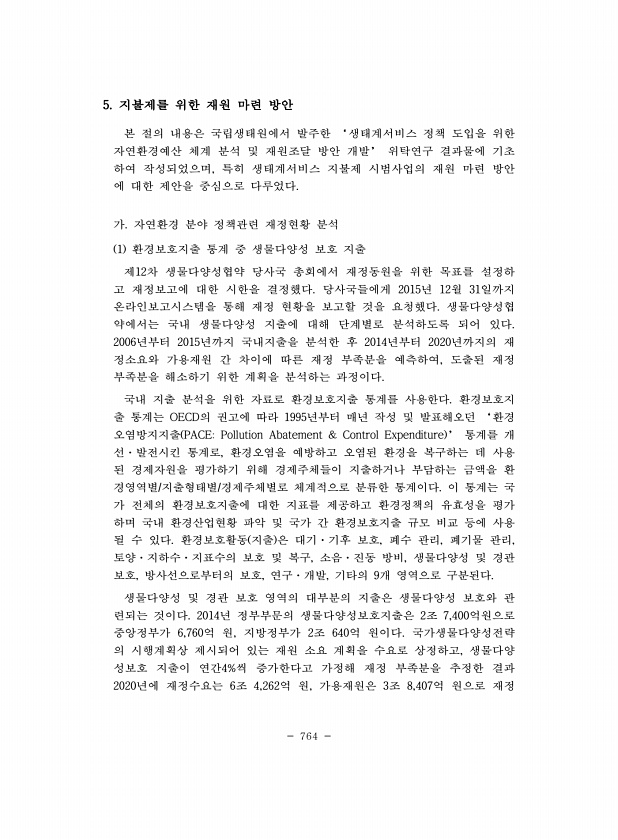 764 5. 지불제를 위한 재원 마련 방안 본 절의 내용은 국립생태원에서 발주한 ‘생태계서비스 정책 도입을 위한 자연환경예산 체계 분석 및 재원조달 방안 개발’ 위탁연구 결과물에 기초 하여 작성되었으며, 특히 생태계서비스 지불제 시범사업의 재원 마련 방안 에 대한 제안을 중심으로 다루었다. 가. 자연환경 분야 정책관련 재정현황 분석 1 환경보호지출 통계 중 생물다양성 보호 지출 제12차 생물다양성협약 당사국 총회에서 재정동원을 위한 목표를 설정하 고 재정보고에 대한 시한을 결정했다. 당사국들에게 2015년 12월 31일까지 온라인보고시스템을 통해 재정 현황을 보고할 것을 요청했다. 생물다양성협 약에서는 국내 생물다양성 지출에 대해 단계별로 분석하도록 되어 있다. 2006년부터 2015년까지 국내지출을 분석한...