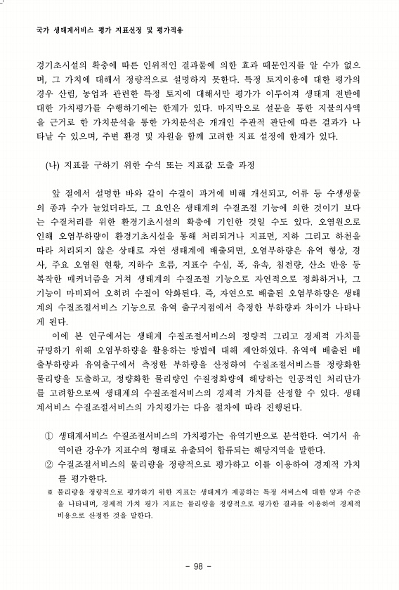 국가 생태계서비스 평가 지표선정 및 평가적용 98 경기초시설의 확충에 따른 인위적인 결과물에 의한 효과 때문인지를 알 수가 없으 며, 그 가치에 대해서 정량적으로 설명하지 못한다. 특정 토지이용에 대한 평가의 경우 산림, 농업과 관련한 특정 토지에 대해서만 평가가 이루어져 생태계 전반에 대한 가치평가를 수행하기에는 한계가 있다. 마지막으로 설문을 통한 지불의사액 을 근거로 한 가치분석을 통한 가치분석은 개개인 주관적 판단에 따른 결과가 나 타날 수 있으며, 주변 환경 및 자원을 함께 고려한 지표 설정에 한계가 있다. 나 지표를 구하기 위한 수식 또는 지표값 도출 과정 앞 절에서 설명한 바와 같이 수질이 과거에 비해 개선되고, 어류 등 수생생물 의 종과 수가 늘었더라도, 그 요인은 생태계의 수질조절 기능에 의...