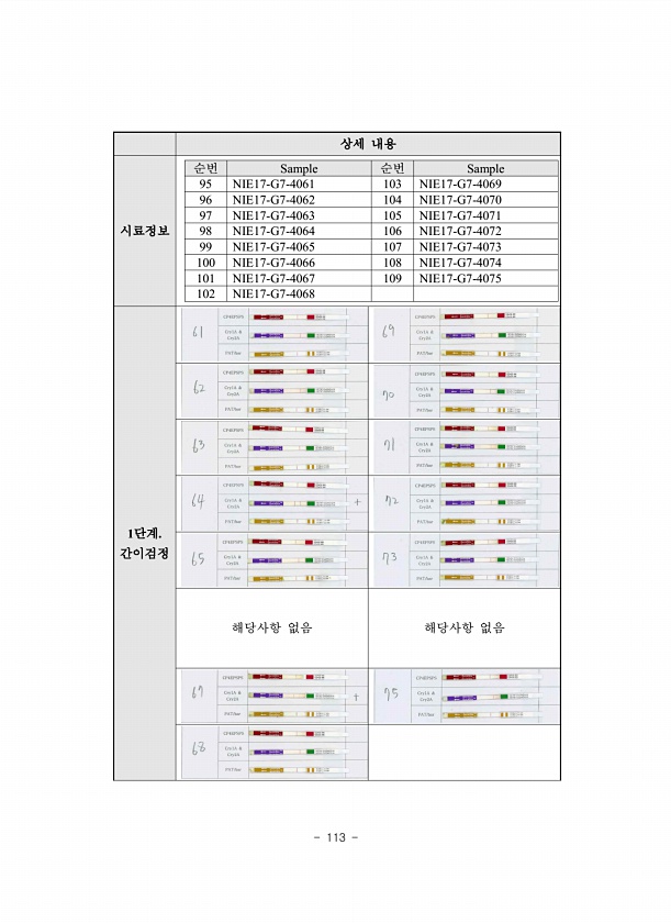 113 상세 내용 시료정보 순번 Sample 순번 Sample 95 NIE17-G7-4061 103 NIE17-G7-4069 96 NIE17-G7-4062 104 NIE17-G7-4070 97 NIE17-G7-4063 105 NIE17-G7-4071 98 NIE17-G7-4064 106 NIE17-G7-4072 99 NIE17-G7-4065 107 NIE17-G7-4073 100 NIE17-G7-4066 108 NIE17-G7-4074 101 NIE17-G7-4067 109 NIE17-G7-4075 102 NIE17-G7-4068 1단계. 간이검정 해당사항 없음 해당사항없음
