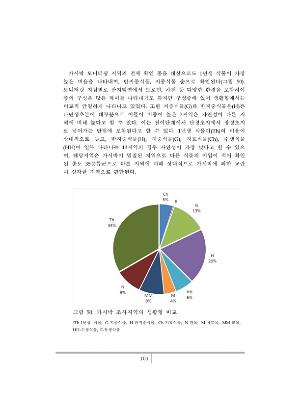 101 가시박 모니터링 지역의 전체 확인 종을 대상으로도 1년생 식물이 가장 높은 비율을 나타내며, 반지중식물, 지중식물 순으로 확인된다 그림 50 모니터링 지점별로 산지임연에서 도로변, 하천 등 다양한 환경을 포함하여 종의 구성은 많은 차이를 나타내기도 하지만 구성종에 있어 생활형에서는 비교적 균일하게 나타나고 있었다. 또한 지중식물 G 과 반지중식물은 H 은 다년생초본이 대부분으로 이들이 비중이 높은 2지역은 자연성이 다른 지 역에 비해 높다고 할 수 있다. 이는 천이단계에서 단경초지에서 장경초지 로 넘어가는 단계에 포함된다고 할 수 있다. 1년생 식물이 Th 의 비율이 상대적으로 높고, 반지중식물 H , 지중식물 G , 지표식물 Ch , 수생식물 HH 이 일부 나타나는 13지역의 경우 자연성이 가장 낮...