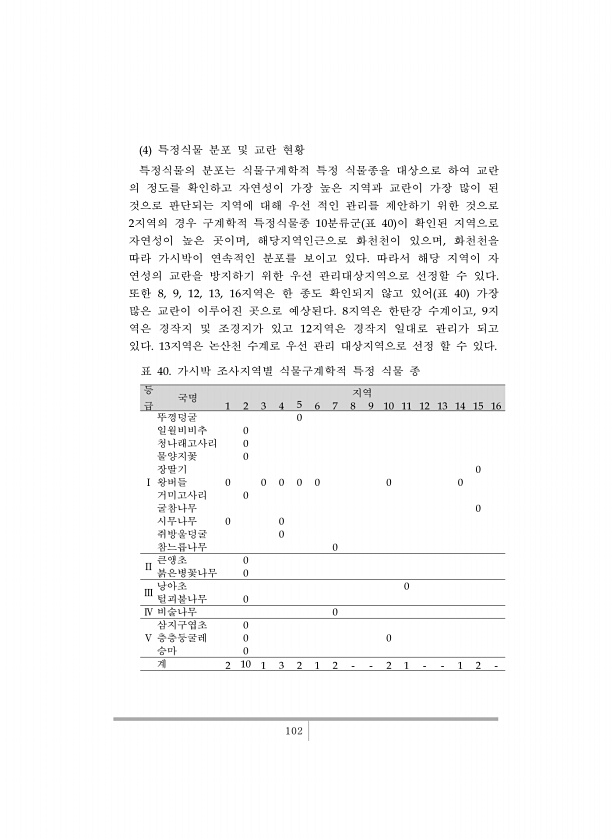 102 4 특정식물 분포 및 교란 현황 특정식물의 분포는 식물구계학적 특정 식물종을 대상으로 하여 교란 의 정도를 확인하고 자연성이 가장 높은 지역과 교란이 가장 많이 된 것으로 판단되는 지역에 대해 우선 적인 관리를 제안하기 위한 것으로 2지역의 경우 구계학적 특정식물종 10분류군 표 40 이 확인된 지역으로 자연성이 높은 곳이며, 해당지역인근으로 화천천이 있으며, 화천천을 따라 가시박이 연속적인 분포를 보이고 있다. 따라서 해당 지역이 자 연성의 교란을 방지하기 위한 우선 관리대상지역으로 선정할 수 있다. 또한 8, 9, 12, 13, 16지역은 한 종도 확인되지 않고 있어 표 40 가장 많은 교란이 이루어진 곳으로 예상된다. 8지역은 한탄강 수계이고, 9지 역은 경작지 및 조경지가 있고 12지역은 경작...