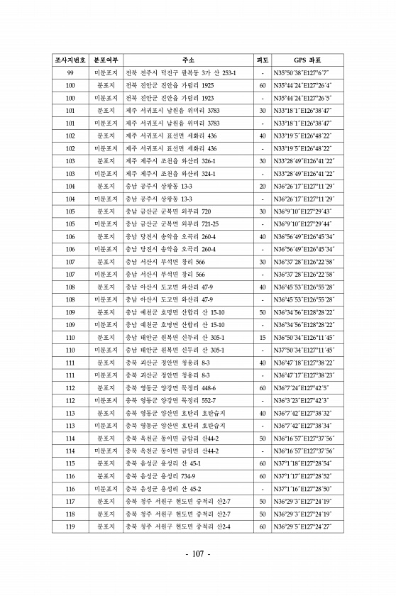 107 조사지번호 분포여부 주소 피도 GPS 좌표 99 미분포지 전북 전주시 덕진구 팔복동 3가 산 253-1 N35°50´38˝E127°6´7˝ 100 분포지 전북 진안군 진안읍 가림리 1925 60 N35°44´24˝E127°26´4˝ 100 미분포지 전북 진안군 진안읍 가림리 1923 N35°44´24˝E127°26´5˝ 101 분포지 제주 서귀포시 남원읍 위미리 3783 30 N33°18´1˝E126°38´47˝ 101 미분포지 제주 서귀포시 남원읍 위미리 3783 N33°18´1˝E126°38´47˝ 102 분포지 제주 서귀포시 표선면 세화리 436 40 N33°19´5˝E126°48´22˝ 102 미분포지 제주 서귀포시 표선면 세화리 436 N33°19´5˝E126°48´22˝ 103 분포지 제주...